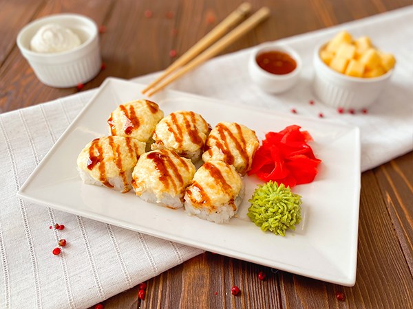 Рис, сёмга, сыр креметте, нори, голландский сыр, сладкий соус чили, соус терияки. Доставляется с имбирём и васаби.