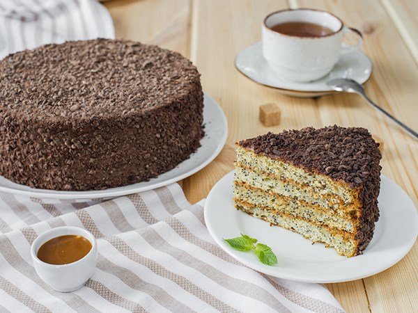 Нежный бисквит с маком, прослоенный кремом со сгущённым молоком.