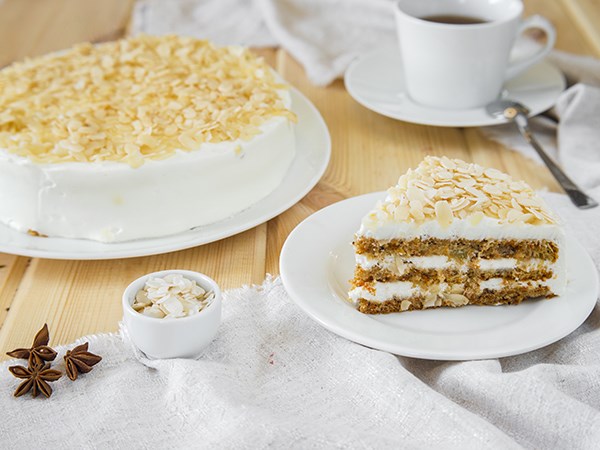 Бисквитные коржи с грецким орехом, ананасом и морковью, прослоенные кремом из сыра креметте.