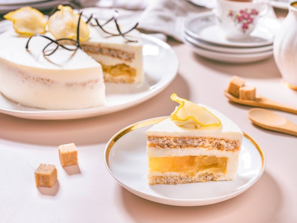 Творожный мусс с фундучным бисквитом и грушей украшен грушевым конфи. Принимается к заказу только за 24 часа!