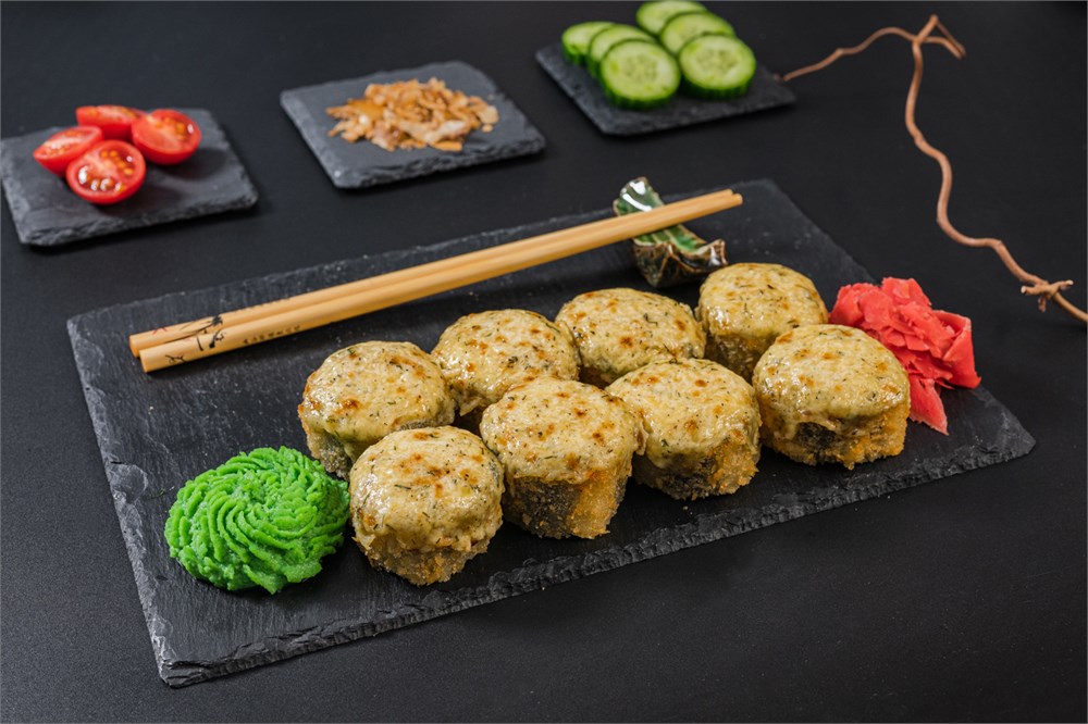 Куриное филе копчёное, лист салата, соус сырный, томат, огурец, рис, нори, сухари панко.