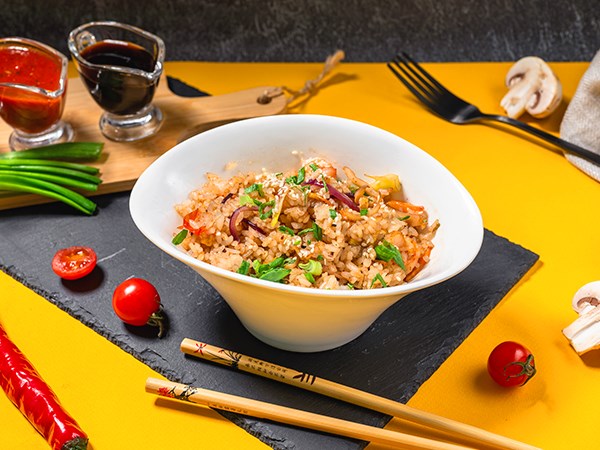 Рис, тигровые креветки, кальмар, красный репчатый лук, морковь, брокколи, томаты, куриное яйцо, перья зелёного лука, соус тяхан, семена кунжута.