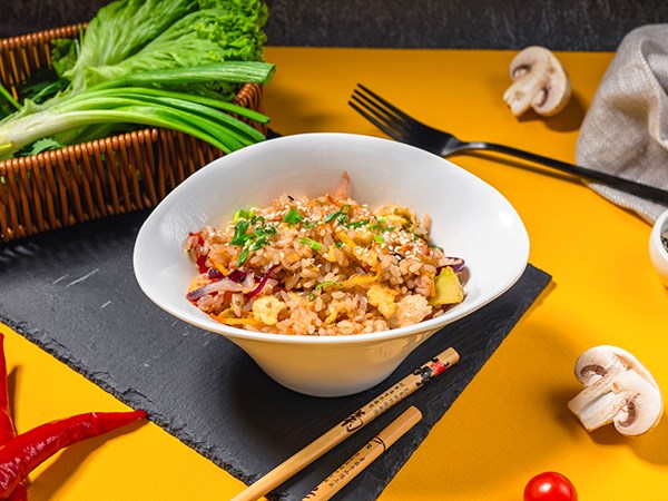 Рис, красный репчатый лук, морковь, брокколи, томаты, куриное яйцо, перья зелёного лука, соус тяхан, семена кунжута.