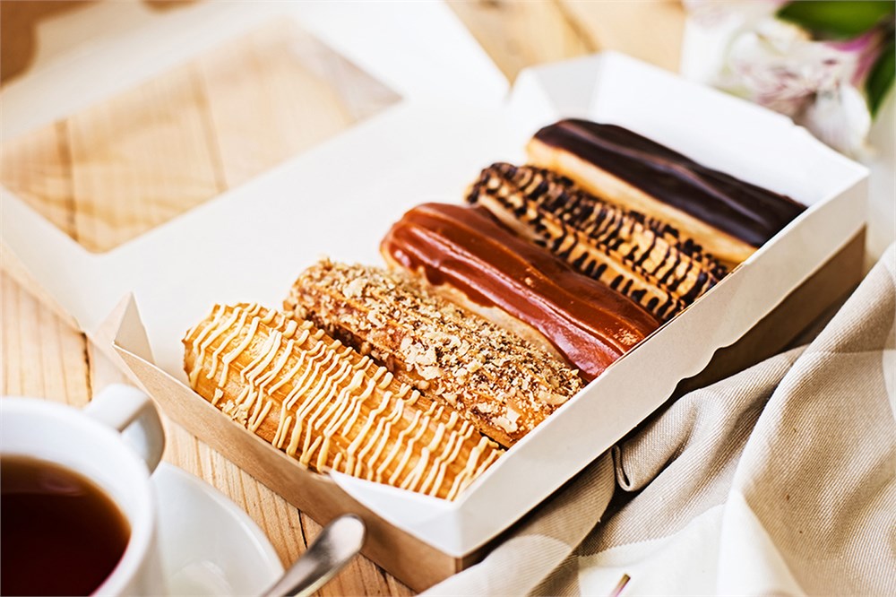 По 1 шт: эклер с заварным кремом, эклер с кремом из кураги, эклер с кремом из грецкого ореха, эклер из варёного сгущённого молока, эклер с карамелью.