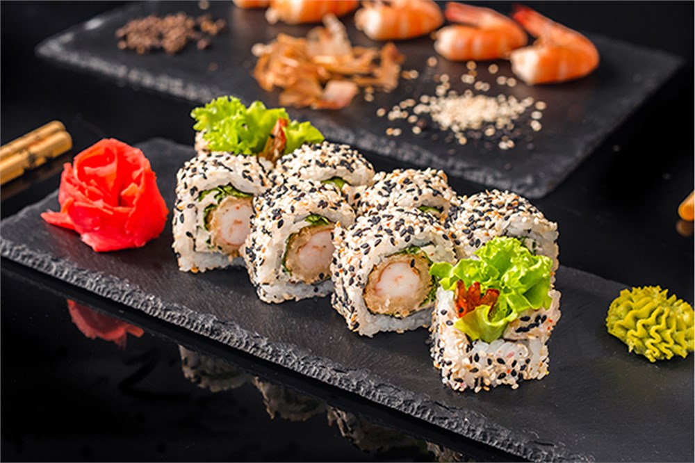 Филадельфия, Калифорния, Онигара, Кани темпура. Палочки, имбирь, васаби и соусы приобретаются отдельно!