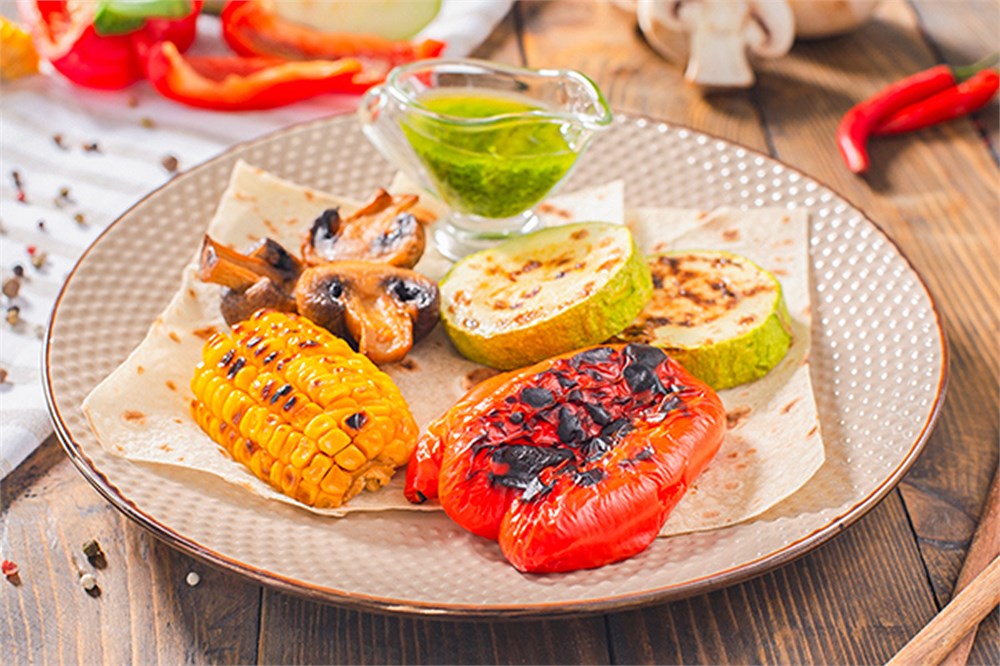 Початок кукурузы, болгарский перец, шампиньоны, кабачок.