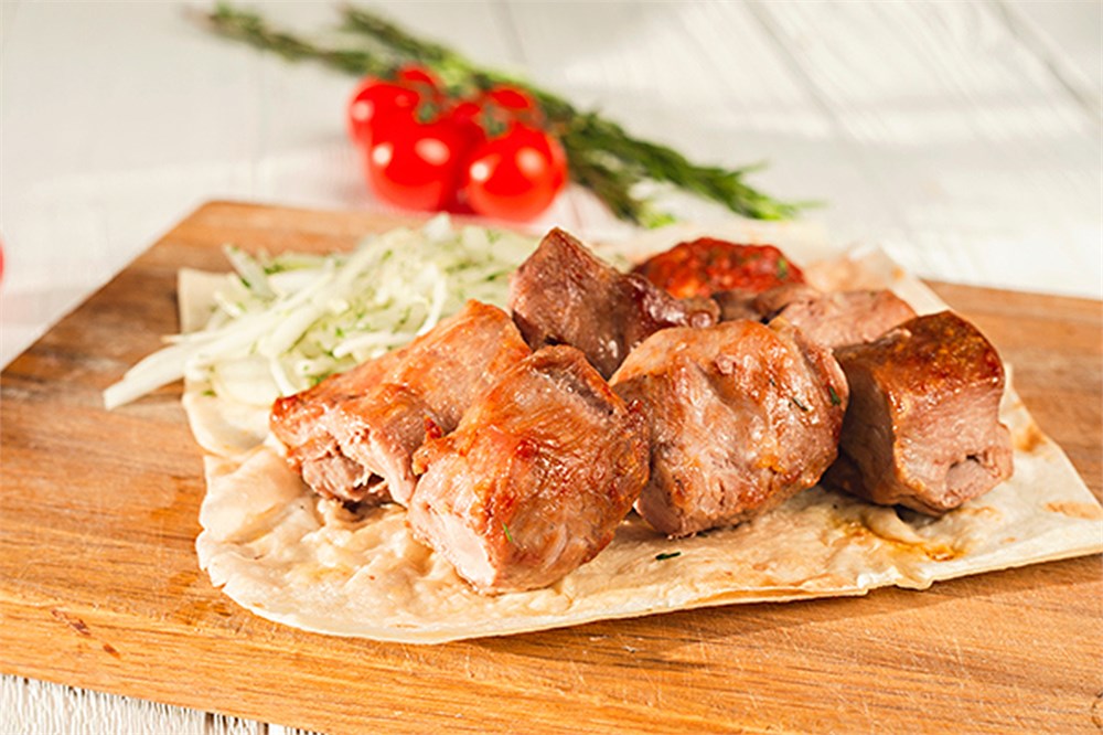 Шашлык– 130 г., соус сацебели – 30 г., лук с зеленью – 30 г., лаваш – 10 г.
