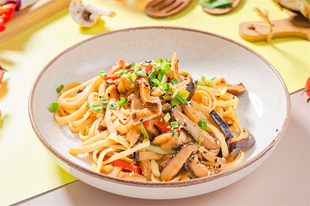 Японская лапша, баклажаны, болгарский перец, чеснок, кокосовое молоко, сладкий соус чили, семена кунжута, перья зеленого лука, шиитаке.